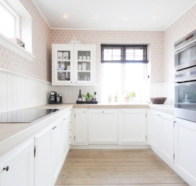 Køkkenet udstyret med romantiks inspirerede skabe og tapet, integreret med moderne teknologi.
